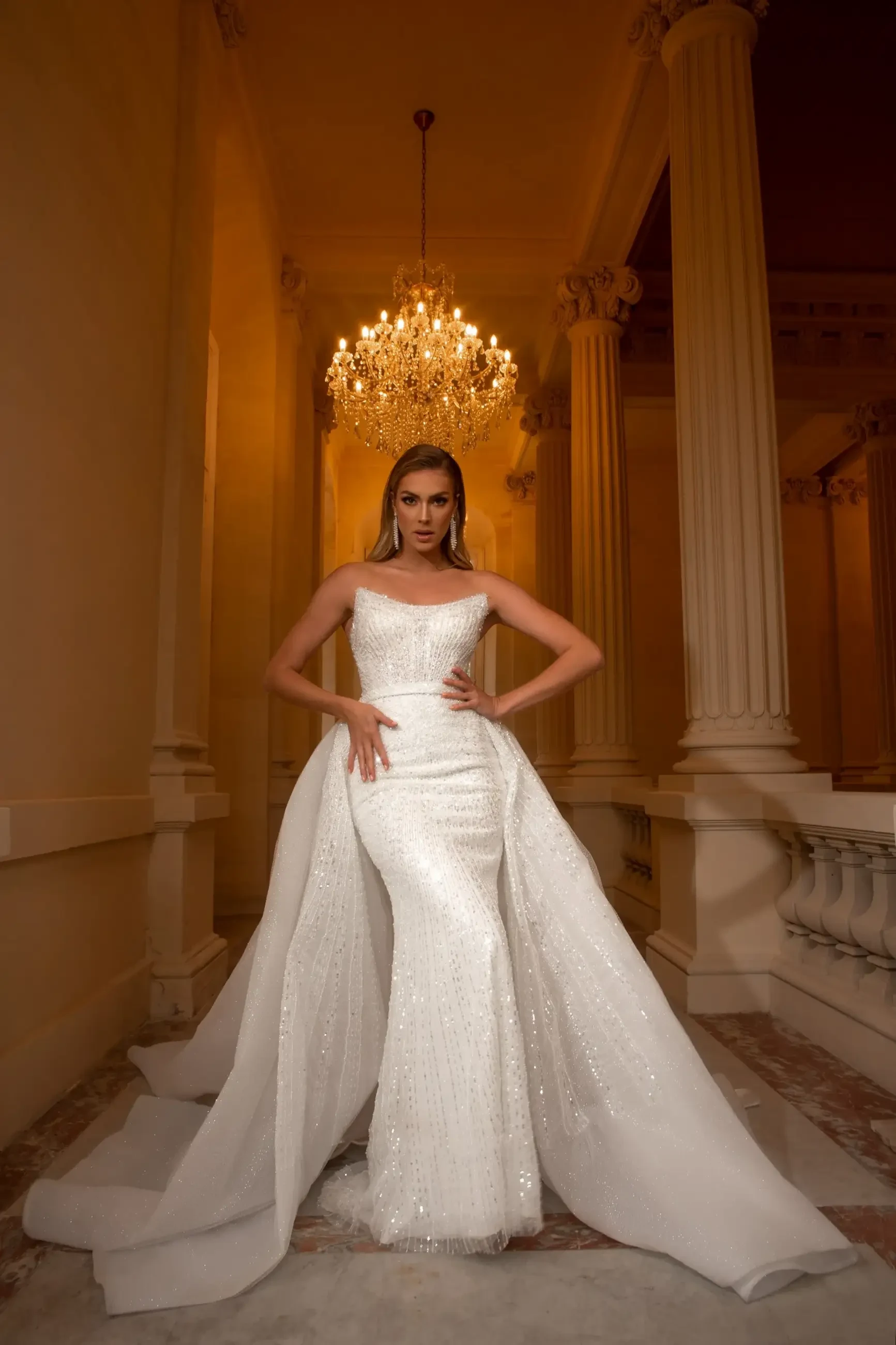This stunning beaded gown exudes sophistication and modern chic. The intricate detailing, sheer sleeves, and dramatic train make it a perfect choice for brides who want to make a statement. A true showstopper, this gown embodies the grandeur of global bridal fashion.